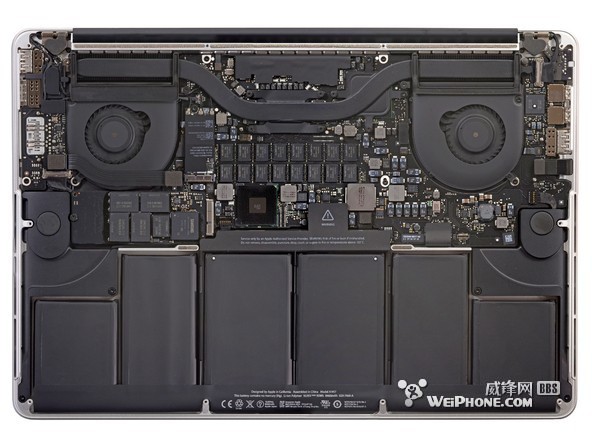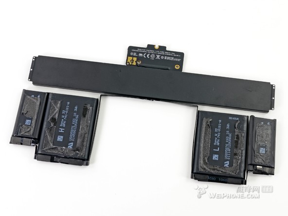 整塊電池一共由 6 個電池單元組成,整體看上去就像一個衣架。和 15 英寸 Retina Macbook Pro 的電池設計相比,“衣架”風格的設計為 13 英寸 Retina Macbook Pro 的內部節省了許多空間。