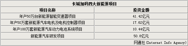 長(zhǎng)城汽車除了強(qiáng)化新能源研發(fā)項(xiàng)目,新能源車的相關(guān)產(chǎn)業(yè)配套項(xiàng)目也已有所布局。“年產(chǎn)50萬(wàn)臺(tái)新能源智能變速器項(xiàng)目”總投資41.42億元,主演開展新能源智能變速器的研發(fā)、試驗(yàn)和生產(chǎn);“年產(chǎn)50萬(wàn)套新能源汽車電機(jī)及電機(jī)控制器項(xiàng)目”總投資額17.62億元;“年產(chǎn)100萬(wàn)套新能源汽車動(dòng)力電池系統(tǒng)項(xiàng)目”總投資額為10.44億元。該項(xiàng)目產(chǎn)品涵蓋PHEV、EV、輕混、強(qiáng)混等四個(gè)子項(xiàng)目的配套動(dòng)力電池系統(tǒng)(包括鋰離子動(dòng)力電池組件和電池管理系統(tǒng))。這三個(gè)項(xiàng)目建設(shè)周期均為30個(gè)月,地點(diǎn)位于河北省徐水經(jīng)濟(jì)開發(fā)區(qū)。