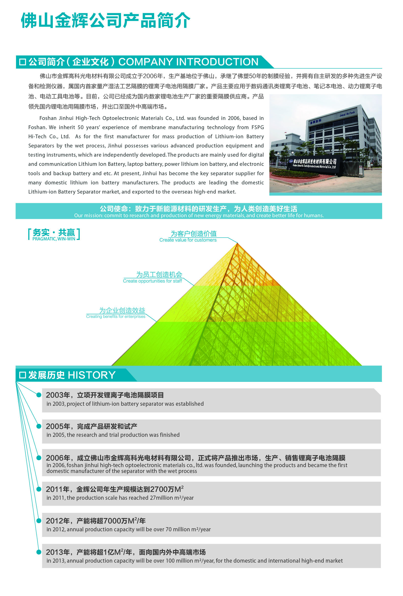 佛山市金輝高科光電材料有限公司(簡(jiǎn)稱金輝公司)成立于2006年,目前注冊(cè)資本為921萬(wàn)美元,是國(guó)內(nèi)第一家使用濕法工藝生產(chǎn)鋰離子電池隔膜的廠家,國(guó)家火炬計(jì)劃重點(diǎn)高新技術(shù)企業(yè),廣東省