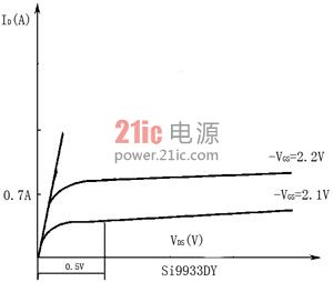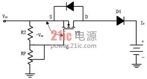 擴(kuò)流部分電路如圖3所示。它由P溝道功率MOSFET(VT)、R及RP組成的分壓器、肖特基二極管D4組成。利用分壓器調(diào)節(jié)P-MOSFET的-VGS大小,使獲得所需擴(kuò)流電流ID.P-MOSFET的輸出特性如圖4所示。在-VGS=2.1V、VDS>0.5V時(shí),其輸出特性幾乎是一水平直線;在不同的VDS時(shí),ID是恒流。從圖4也可以看出,在-VGS增加時(shí),ID也相應(yīng)增加。