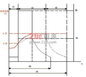 原充電器以1A電流充電,若擴(kuò)流電流為1A,則在恒流充電階段時(shí)充電電流為2A.圖5中紅線為充電電池電壓特性、黑線為充電電流特性,實(shí)線為加擴(kuò)流特性,虛線為未加擴(kuò)流特性。從圖5可看出:擴(kuò)流的充電時(shí)間t5比不擴(kuò)流的時(shí)間要短;并且也可以看出:擴(kuò)流僅在恒流充電階段進(jìn)行。