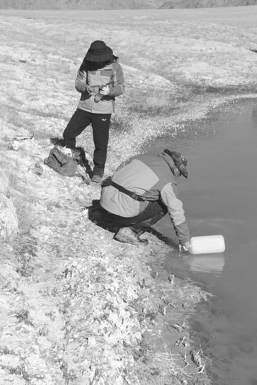 ②在甘肅高臺鹽池進行野外采樣及溫度電導率pH 值測量。