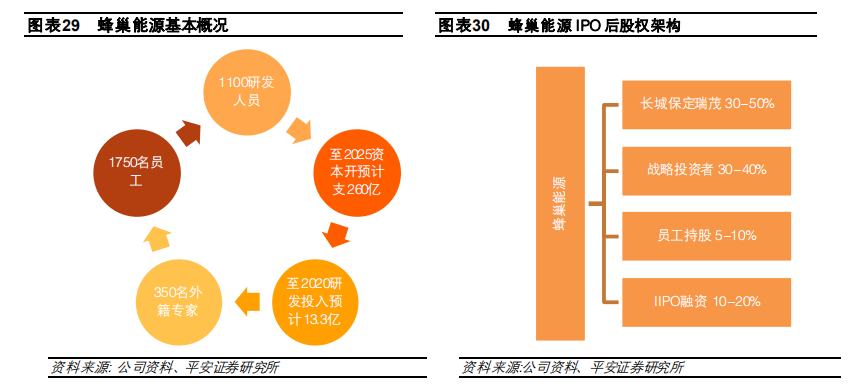 長(zhǎng)城汽車于2012年成立動(dòng)力電池項(xiàng)目組,2016年動(dòng)力電池事業(yè)部成立,2018年蜂巢能源正式成立,從事動(dòng)力電池核心材料、電芯、模組、PACK、BMS、儲(chǔ)能、太陽能的專業(yè)研發(fā)和制造,現(xiàn)有研發(fā) 人員 1100 人左右,研發(fā)費(fèi)用 2016-2020 年 5 年投入約 30 億,到 2025 年,蜂巢將投入使用美國(guó)、京津冀、韓國(guó)、日本、上海、無錫和印度 7 大研發(fā)中心。