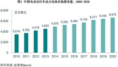 近日,益普索(Ipsos)發(fā)布《中國(guó)電動(dòng)車(chē)及電動(dòng)車(chē)動(dòng)力電池市場(chǎng)及行業(yè)分析》研究報(bào)告。報(bào)告稱(chēng),由于政府鼓勵(lì)使用替代能源減小對(duì)石油的依賴(lài)性,受環(huán)境友好型電動(dòng)汽車(chē)制造商強(qiáng)勁需求的推動(dòng),電池產(chǎn)品市場(chǎng)在2013年至2020年間有望取得12%的復(fù)合年增長(zhǎng)率。益普索數(shù)據(jù)顯示據(jù)預(yù)測(cè),電池產(chǎn)品總銷(xiāo)售額將于2020年達(dá)到112億美元,較2012年的約52億美元翻了一倍多。