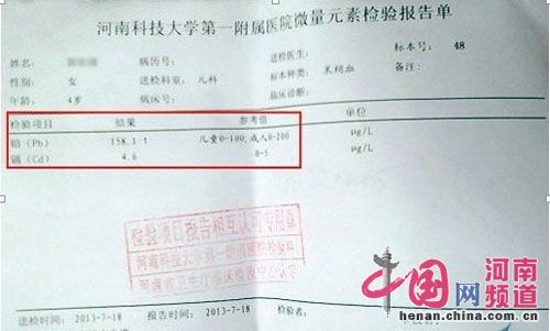 據(jù)媒體此前報道,今年7月中旬,西山底鄉(xiāng)南洞村數(shù)名兒童出現(xiàn)血鉛中毒,其中一名4歲女童小婕出現(xiàn)多動、厭食等癥狀,經(jīng)河南科技大學(xué)第一附屬醫(yī)院化驗檢查,結(jié)果顯示其血液中鉛含量達(dá)158.1ug/L(毫克/升)屬鉛中毒。