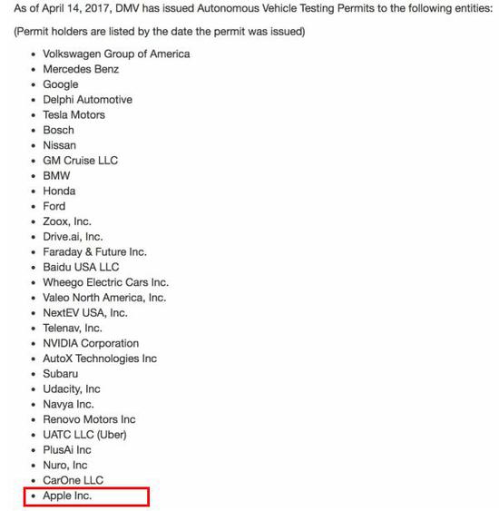 2017年4月,加州的機(jī)動(dòng)車管理局(DMV)批準(zhǔn)蘋果在公共道路上測(cè)試自動(dòng)駕駛汽車。以下是在加州測(cè)試自動(dòng)駕駛汽車的公司名單: