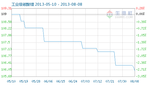 8月8日工業(yè)級(jí)碳酸鋰商品指數(shù)為105.99,較昨日下降了0.22點(diǎn),較周期內(nèi)最高點(diǎn)112.10點(diǎn)(2012-11-04)下降了5.45%,較2012年01月05日最低點(diǎn)98.94點(diǎn)上漲了7.13%。(注:周期指2011-09-01至今) 工業(yè)級(jí)碳酸鋰商品