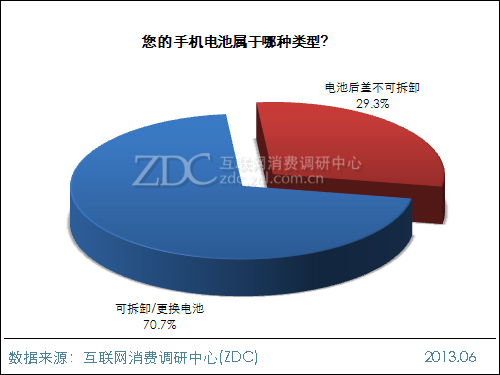 ZDC 調查數據顯示,參與調查的近千名中國IT網民中,七成用戶所使用的手機電池為可拆卸、可更換型,同時在偏好程度的選擇上,67.3%的IT網民表示喜歡可 拆卸、可更換電池的手機,有超一成的IT網民明確表示不喜歡不可拆卸/更換電池的手機。另有兩成網民對手機電池是否可拆卸/更換表示無所謂。