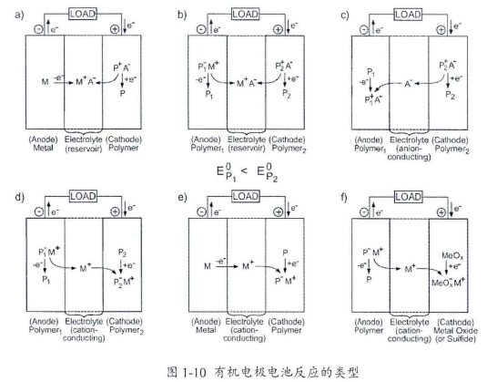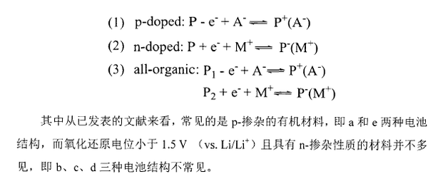 其中P1、P2為有機電極材料(可以是小分子也可以是聚合物),M+,A+為摻雜的正負離子,通常為Li+、Na+、(C4H9)4N+和Cl\ CICV、PF6-等。P1-M+,P2+A-、PI+A-、P2-M+為摻雜后的有機電極材料。