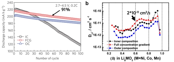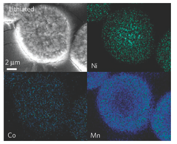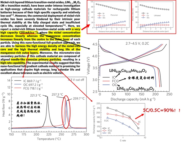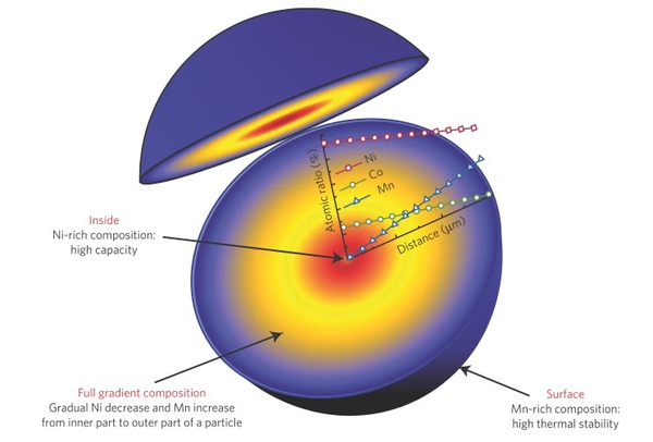 在這種梯度材料中,元素的含量由顆粒中心到外層呈現(xiàn)一種連續(xù)的梯度分布,保證了成分的均質(zhì)。在這篇集合了五行三才之力的杰作中,Sun Yang-Kook發(fā)現(xiàn)了一種核心部分的富鎳組成逐步過渡到外殼的富錳組成這么一種復(fù)合材料。