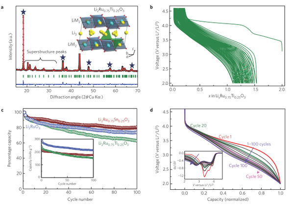 Li2RuxM(1-x)O3其實是一種類似富鋰錳基材料中Li2MnO3的一種單斜結構的層狀材料,看下圖的圖a中的超晶格部分的衍射峰可知,在晶體圖上也可以看出這個是一個明顯的層狀材料。從下圖b中可知,在2~4.6V區間的充放電的特征跟Li2MnO3也是一模一樣!都是在4.50V左右有一個明顯的長平臺,然后在第二周往后就消失了,同時帶來了不可逆容量的損失。由下圖c可知,作者對比了三種材料:Li2Ru0.75Ti0.25O3、Li2RuO3和Li2Ru0.75Sn0.25O3,這三種材料中純相的Li2RuO3展示了首周放電接近300mAh/g的比容量,非常的高,然后Li2Ru0.75Ti0.25O3低一些有接近250mAh/g,Li2Ru0.75Sn0.25O3最低220mAh/g左右,但是從循環性能來看,Li2Ru0.75Sn0.25O3是保持的最好的一個,100周過去了還有接近85%的循環保持率,最差的是Li2Ru0.75Ti0.25O3,100周過后掉到了70%以下!!!