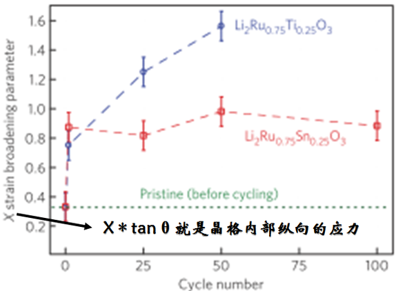 從上圖看到對比三種材料在充放電不同周數的微觀應力數值的大小,可以得出摻入了Ti4+的材料內部應力變化非常大,而摻入了Sn4+的材料則變動很小,這種內部應力的變化究竟是由什么造成呢?在Li2Ru0.75Ti0.25O3這里究竟發生了什么?我們來看下圖: