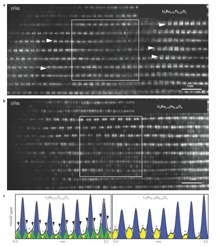 上圖中綠色的柱狀峰代表四面體占位的金屬離子,而藍色的峰代表八面體占位的鋰離子,黃色的峰代表八面體占位的金屬離子,我們可以看到,經過循環后,Li2Ru0.75Ti0.25O3材料里有不少的四面體占位Ti4+而Li2Ru0.75Sn0.25O3里幾乎沒有四面體占位的Sn4+。