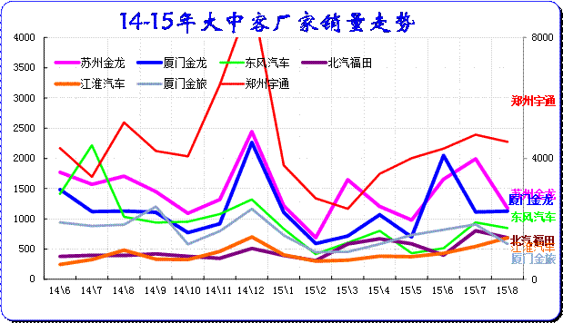 由于新能源補貼和客運需求的促進,15年6月的大客的市場表現較強,8月延續走強態勢,宇通和金龍等主力企業走勢很好。