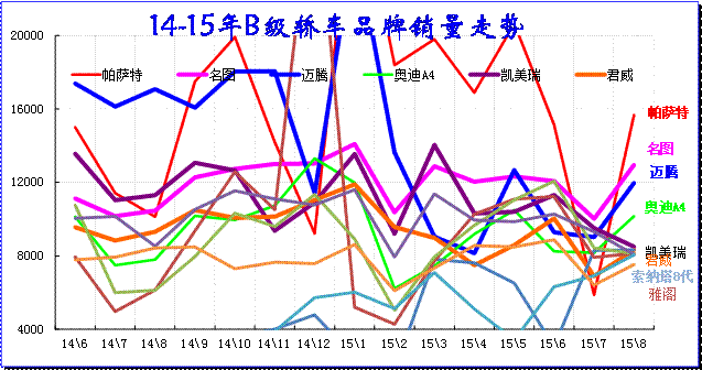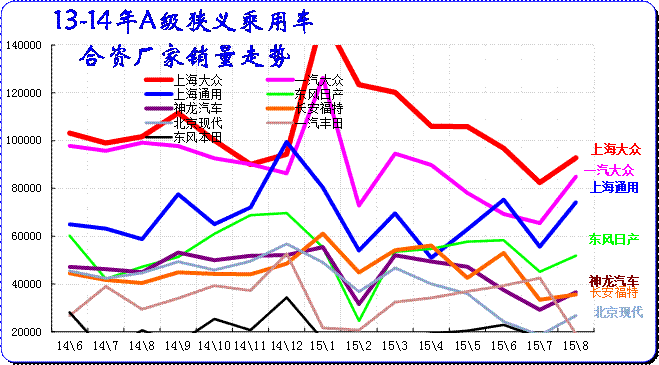 A 級車是合資企業超強的主力細分市場,主力廠家在此堆積較大銷量,南北大眾和通用的表現超強。南北大眾15年開門紅,但總體看合資A級車增長嚴重乏力。南北大眾15年走勢仍是合資品牌中最強的,但近幾個月的下滑幅度也是最大的。通用開始調整,新組合效果逐步提升銷量。現實看南北大眾和通用的A級車銷量分化。長安福特和神龍的A級車走弱明顯。日系的A級車開始走強的趨勢,一汽豐田尤為突出,8月稍有異常。韓系有明顯走弱趨勢。