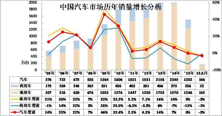 圖表 1汽車05-2015年表現對比分析  單位  萬臺,%