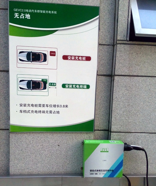 壁掛式充電樁,解決了地面不足難題。(記者 王宗陽 攝)