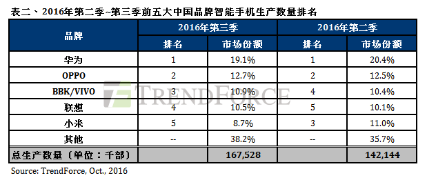 第三季華為智能手機生產數量達3200萬部,季成長約10.3%,穩坐全球第三。雖然雙鏡頭旗艦機種P9在其他中國智能手機品牌夾擊下銷售不如預期,但在旺季需求帶動下,華為整體生產數量仍持續在第三季攀高。