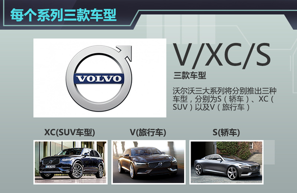 在三大整車系列之后,沃爾沃在具體車型上也有了明確的定位。以90系列為例,沃爾沃在推出SUV產品全新XC90之后,還將推出旅行車V90與轎車S90兩款產品,形成全新90系列家族。同時,沃爾沃60系列未來也將基于SPA模塊化架構打造,推出三款對應車型。在緊湊級細分領域,沃爾沃在開發全新CMA模塊化架構后,將基于此架構分別打造XC40、新一代S40與V40,根據沃爾沃公布的規劃,CMA模塊化架構的首款車型將是XC40,該車彌補了沃爾沃在緊湊級SUV細分領域的空白。