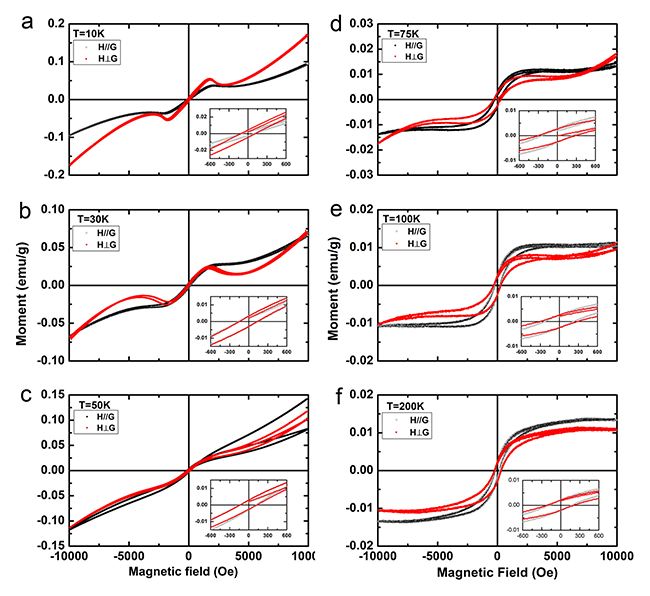 圖2 在不同溫度下石墨烯的磁矩隨磁場強度的變化曲線。每幅圖右下角的插圖為在低場下的放大圖。