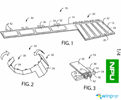 在專利圖上,我們可以看到,電池被分割成很多個小節,并且通過類似手表腕帶的形式進行聯結,多個可折疊的小電池通過層疊的方式可以構成一塊標準大小的電池。這樣的設計可以充分利用有限度的空間來開發便攜式電子設備,這款設備的外觀可能類似于手表。
