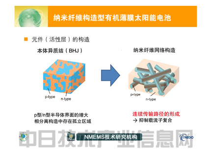 此次的有機薄膜太陽能電池采用了p型半導體與n型半導體的接觸面積大、可提高發電效率的本體異質結。而且采用了使p型半導體變成納米級微細纖維狀、在其他部分填充了n型半導體的結構(圖3)。