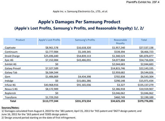在提交給陪審團的三星侵權產品圖表中,蘋果著重指出了兩款銷售額最高的手機設備,包括Infuse4G(累計銷售額1.35億美元)和Droid Charge(8100萬美元),這兩款手機目前已經在美國地區下市。