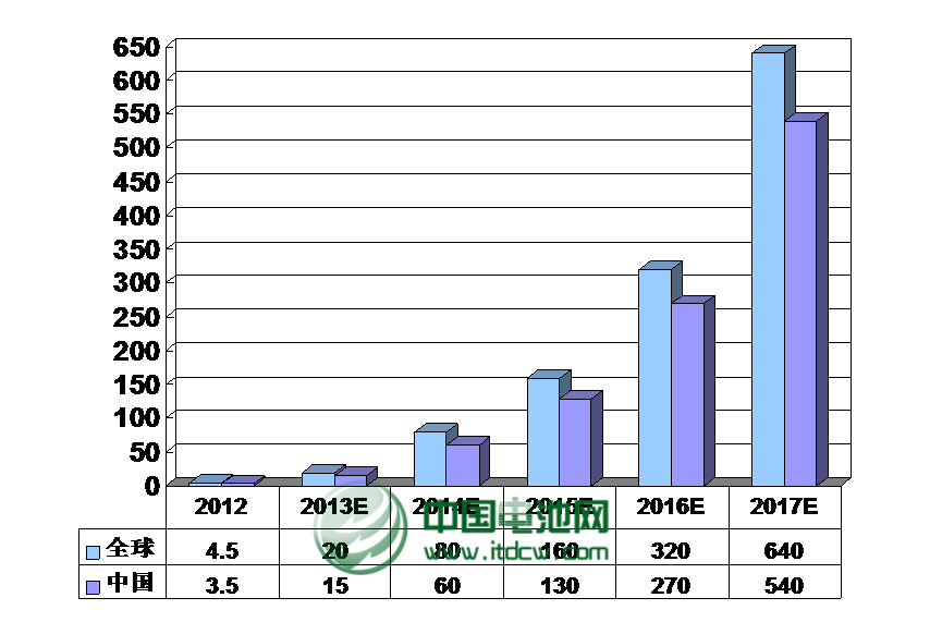 ② 真鋰研究預(yù)計(jì),2013年將會(huì)有15萬輛電動(dòng)三輪車使用鋰離子電池,而到2017年將會(huì)達(dá)到540萬輛,年均復(fù)合增長(zhǎng)率將高達(dá)驚人的174.95%;