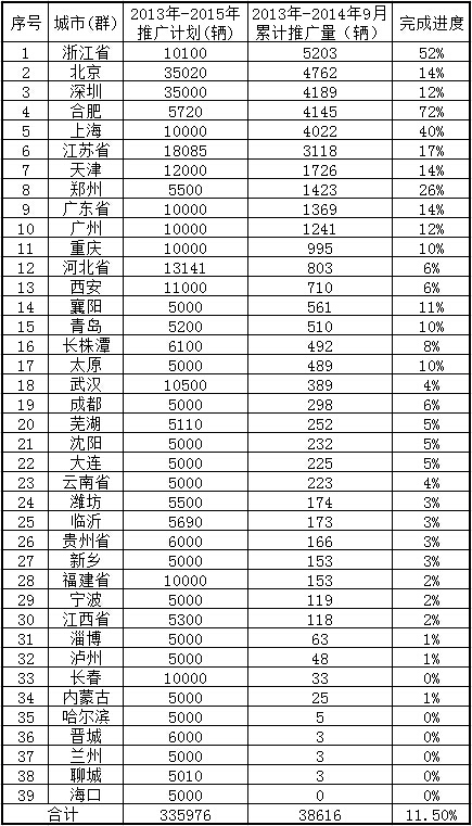 按照新能源汽車推廣應用城市(群)申報計劃,2013年至2015年39個推廣應用城市(群)將累計推廣新能源汽車33.6萬輛。截止到2014年9月,我國共推廣新能源汽車38616輛,僅完成計劃的11.5%。
