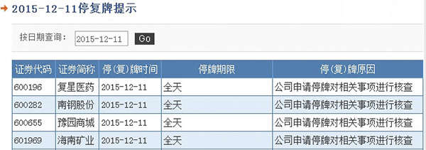 其中,上交所發(fā)布公告稱,復星系在上交所上市的復星醫(yī)藥(600196)、南鋼股份(600282)、豫園商城(600655)、海南礦業(yè)(601969)申請今日全天停牌,停牌原因為:將對相關事項進行核查。而深交所也發(fā)布公告稱,因“公共傳媒出現(xiàn)關于上海鋼聯(lián)電子商務股份有限公司的信息,可能對公司股票交易價格產(chǎn)生較大影響”,上海鋼聯(lián)(300226)于2015年12月11日開市起停牌,待公司通過指定媒體披露澄清公告后復牌。