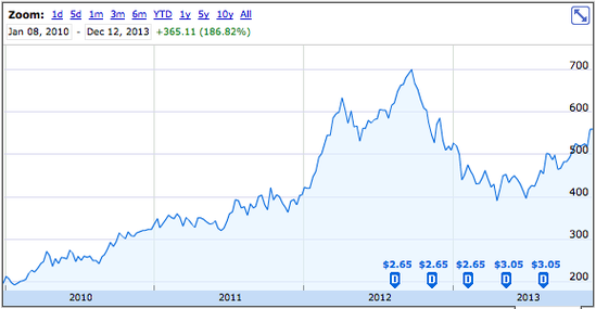 在2010年代最初的4年,蘋果股價創下新高并且該公司開始支付股息,同時回購公司股票。