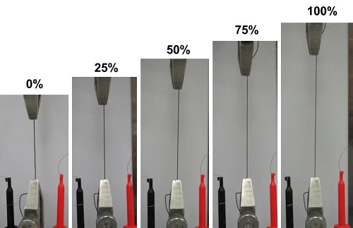 我校高分子科學系和先進材料實驗室彭慧勝教授設計了一種旋轉平移法,可有效結合高分子的彈性及碳納米管的優異電學和機械性能,首次成功制備出可拉伸的線狀超級電容器(圖1)。這種電容器可彎曲、折疊和拉伸,且在拉伸75%的情況下能100%保持電容器的各項性能(圖2)。這種線狀電容器可進一步編織成各種形狀的織物,并可集成于各種微型電子器件上,從而滿足未來對于微型能源的需求。