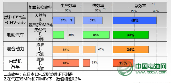 事實(shí)上是,電解水氫氣的過程確實(shí)需要耗費(fèi)大量的能量,制造一千克的氫氣就要消耗50-60度電,在豐田的FCHV-adv車上能儲(chǔ)存6千克的氫氣。相比于汽油高達(dá)80%-85%的生產(chǎn)效率,氫氣的生產(chǎn)效率目前僅為50%-60%。不過隨著技術(shù)的進(jìn)步,這一數(shù)字也會(huì)逐漸提高。更重要的是,雖然氫氣的生產(chǎn)效率低,但是其熱效率高,而最終的45%的總熱效率是電動(dòng)汽車所不能比擬的。