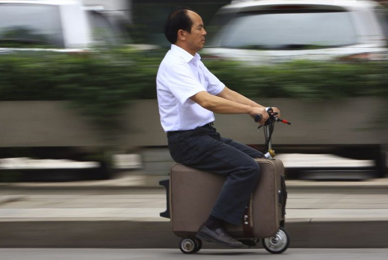 長沙農民賀亮才鼓搗10余年發明載人電動行李箱