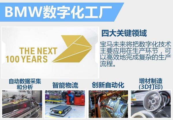 在智能化生產(chǎn)方面,未來寶馬集團將主要聚集于四個關(guān)鍵領(lǐng)域。首先自動數(shù)據(jù)采集和分析,通過全新3D工廠數(shù)據(jù)使精確規(guī)劃成為可能,并實現(xiàn)數(shù)字系統(tǒng)和結(jié)構(gòu)與現(xiàn)有系統(tǒng)完美結(jié)合,進一步提高生產(chǎn)靈活性;另外智能化物流則為增強供應(yīng)網(wǎng)絡(luò)的透明度,并進行優(yōu)化;創(chuàng)新的自動化系統(tǒng)則能直接為員工的生產(chǎn)工作提供幫助,通過機器人等科技的加入減輕工作壓力;最后關(guān)于增材制造則是指3D打印技術(shù)的批量生產(chǎn),為客戶定制車輛零部件和預(yù)留備件。