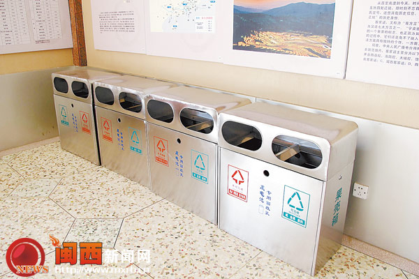 永定二中是全市較早開始做垃圾分類回收的學校。2001年,該校就設立了電池回收點,并時常開展綠色環保的宣傳活動。學校每年把收集起來的廢舊電池交與該縣的垃圾回收站。圖為該校教學樓門口的果殼箱,上面設立了電池回收專用孔。  記者 劉玉榮 攝