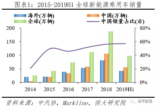 2019上半年中國新能源乘用車市場份額過半,增速遠超海外。據中汽協統計,2019H1國內新能源乘用車(EV+PHEV)銷售56.29萬輛,同比增長57.75%。據Markline統計,2019H1海外新能源乘用車銷售42.13萬輛,同比增長24.50%。2019H1全球新能源乘用車合計銷售98.42萬輛,中國占比57.19%,超過一半,增速較國外高33.25個百分點。