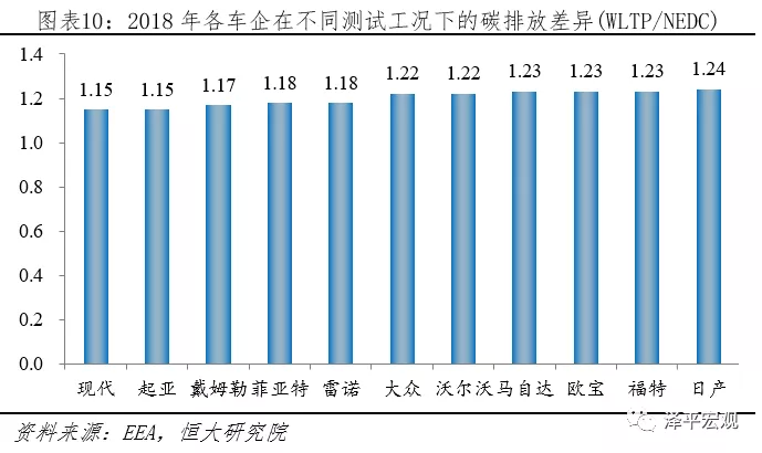 3)測試標(biāo)準(zhǔn)更嚴(yán):2021年開始執(zhí)行WLTP測試標(biāo)準(zhǔn),相比NEDC測試標(biāo)準(zhǔn)而言,WLTP測試標(biāo)準(zhǔn)測試距離長、周期多、速度快,更接近實(shí)際。根EEA發(fā)布的2018年歐盟乘用車測試數(shù)據(jù)顯示,WLTP標(biāo)準(zhǔn)下乘用車碳排放相比NEDC平均高出21%左右,主流車企測試結(jié)果顯示高出15%-24%。