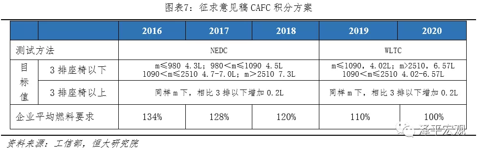 1)傳統(tǒng)燃油車油耗趨嚴(yán),鼓勵(lì)發(fā)展低油耗車型。新《積分辦法》將傳統(tǒng)燃油車測試方法從NEDC調(diào)整為WLTC工況,中汽中心數(shù)據(jù)顯示其油耗將較NEDC工況惡化10.6%。此外,燃料消耗量目標(biāo)值下調(diào)10%左右。