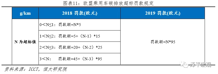 4)罰款力度更重:2018年根據(jù)碳排放具體值分階段處罰,但是從2019年起全部按照最高標(biāo)準(zhǔn)處罰,每超標(biāo)1g/km罰款95歐。2018年歐盟范圍內(nèi)注冊新乘用車碳排放平均值121g/km,銷售1562萬輛;假設(shè)2020年碳排放和銷量保持不變,需要罰款(121-95)×1562×95=385.8億歐元。