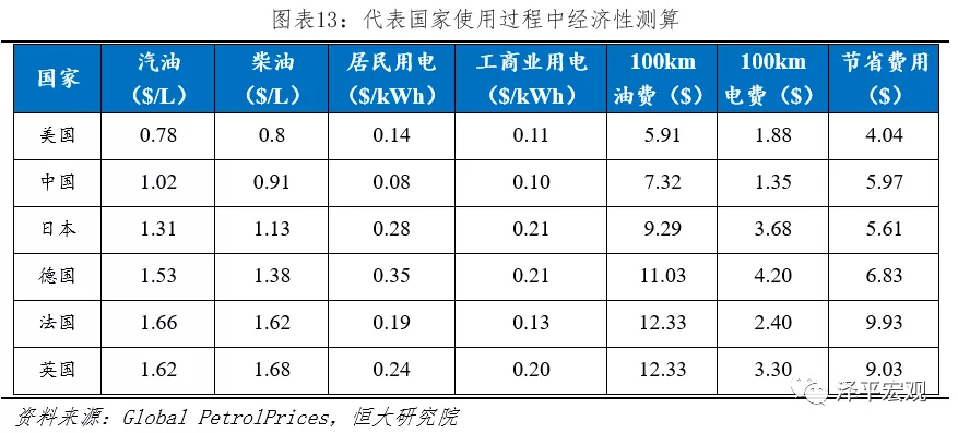 需求端:歐洲人對新能源汽車接受度更高,其燃油經(jīng)濟(jì)性更強(qiáng)。相比中國,歐盟在發(fā)展新能源汽車方面有幾大優(yōu)勢:1)歐洲人環(huán)保意識強(qiáng),偏好緊湊型車,新能源汽車接受度高,2018年歐盟A00、A0、A型小轎車合計(jì)占比41%;2)歐洲推廣電動(dòng)汽車經(jīng)濟(jì)性更強(qiáng),按照純電動(dòng)乘用車電耗每100km消耗15kWh,工業(yè)/居民用電各50%,乘用車汽油車、柴油車占比60%、40%,每100km耗油7.5L計(jì)算,使用純電動(dòng)車每100km美國、中國、日本、德國、法國、英國車企可分別節(jié)約4.04、5.97、5.61、6.83、9.93、9.03美元。