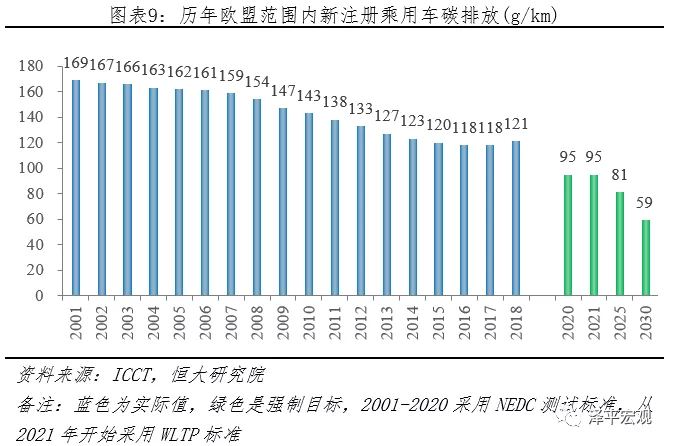 1)目標(biāo)值降幅大:2021年開始采用新測試標(biāo)準(zhǔn)WLTP,乘用車排放不得高于95g/km,2025年、2030年分別在2021年基礎(chǔ)上減少15%、37.5%。據(jù)國際清潔交通委員會(huì)(ICCT)披露,歐盟乘用車企實(shí)際碳排放從2001年169g/km下降到2018年121g/km,年均降幅僅1.9%。