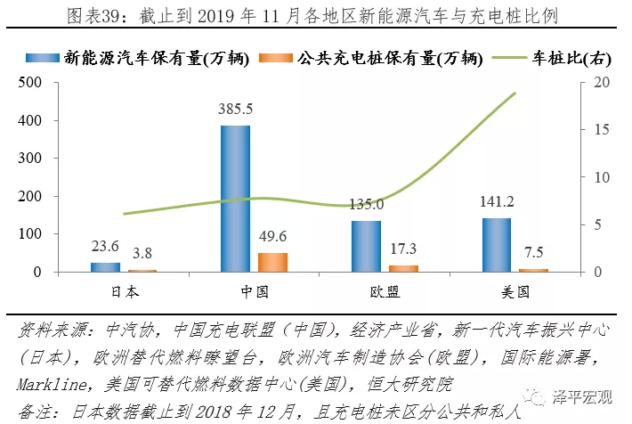 截止到2019年11月,據(jù)中汽協(xié)、中國充電聯(lián)盟統(tǒng)計(jì),中國新能源汽車、公共充電樁保有量分別為385.5萬輛、49.6萬個(gè),對(duì)應(yīng)車樁比7.77:1;據(jù)ACEA、歐盟替代燃料瞭望臺(tái)統(tǒng)計(jì),歐盟新能源汽車、公共充電樁保有量分別為135.0萬輛、17.3萬個(gè),對(duì)應(yīng)車樁比7.78:1;據(jù)Markline、美國可替代燃料數(shù)據(jù)中心統(tǒng)計(jì),美國新能源汽車、公共充電樁保有量分別為141.2萬輛、7.5萬個(gè),對(duì)應(yīng)車樁比18.88:1。截止到2018年12月,據(jù)日本經(jīng)濟(jì)產(chǎn)業(yè)省披露,日本新能源汽車保有量23.6萬輛;據(jù)新一代汽車振興中心披露,充電樁保有量3.8萬個(gè),對(duì)應(yīng)車樁比6.15:1。
