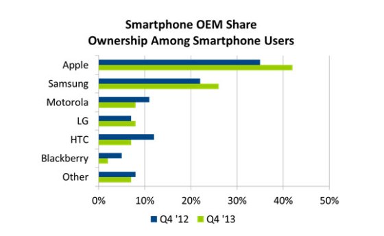 報告顯示,這一季度iPhone在美國智能手機市場上的占有率為42%,高于去年同期的35%;三星Android手機所占份額為26%,高于去年同期的22%。NPD是第一家公布去年底美國智能手機市場相關數據的研究公司。