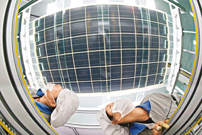 江蘇贛榆縣經濟開發區一家能源公司的工人在檢驗出口歐洲的太陽能光伏產品 因歐盟的“雙反”,中國光伏產業引發關注。2007年中國光伏元件產量躍居世界第一,且生產成本下降速度居于首位