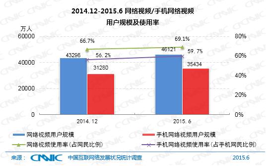 截至2015年6月,中國網絡視頻用戶規模達4.61億,較去年年底增加2823萬人,網絡視頻用戶使用率為69.1%,比去年年底上升了2.3個百分點。其中,手機視頻用戶規模為3.54億,與2014年底相比增長了4154萬人,增長率為13.3%。網民使用率為59.7%,相比2014年底增長3.5個百分點。手機端視頻用戶占總體的76.8%,比2014年年底提升了4.6個百分點,移動視頻用戶的增長依然是網絡視頻行業用戶規模增長的主要推動力量。
