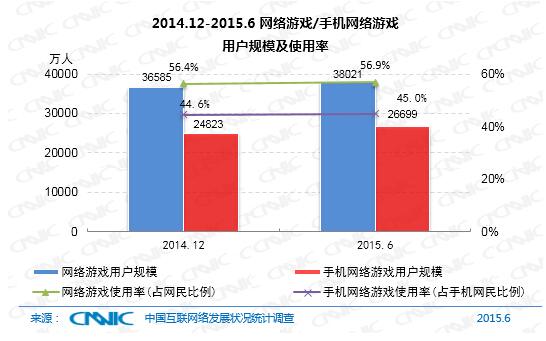 截至2015年6月,網民中網絡游戲用戶規模達到3.80億,較去年底增長了1436萬人,占整體網民的56.9%,其中手機網絡游戲用戶規模為2.67億,較去年底增長了1876萬人,占手機網民的45%。