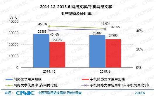截至2015年6月,網絡文學用戶規模較去年底略有減少,達到2.85億,較去年底減少了918萬人,占網民總體的42.6%,其中手機網絡文學用戶規模為2.49億,較去年底增加了2282萬人,占手機網民的42%。