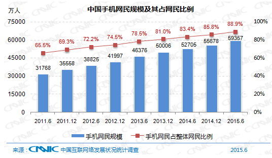 截至2015年6月,我國手機網民規模達5.94億,較2014年12月增加3679萬人。網民中使用手機上網的人群占比由2014年12月的85.8%提升至88.9%。