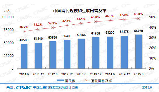 截至2015年6月,我國網民規模達6.68億,半年共計新增網民1894萬人。互聯網普及率為48.8%,較2014年底提升了0.9個百分點,整體網民規模增速繼續放緩。